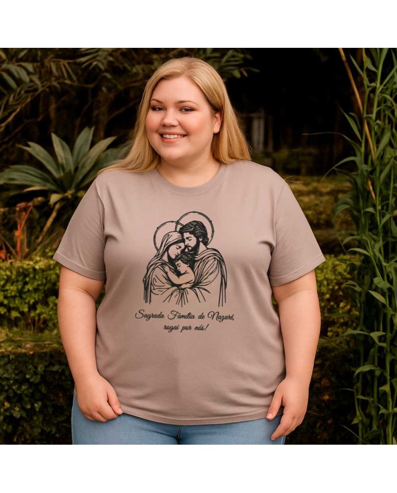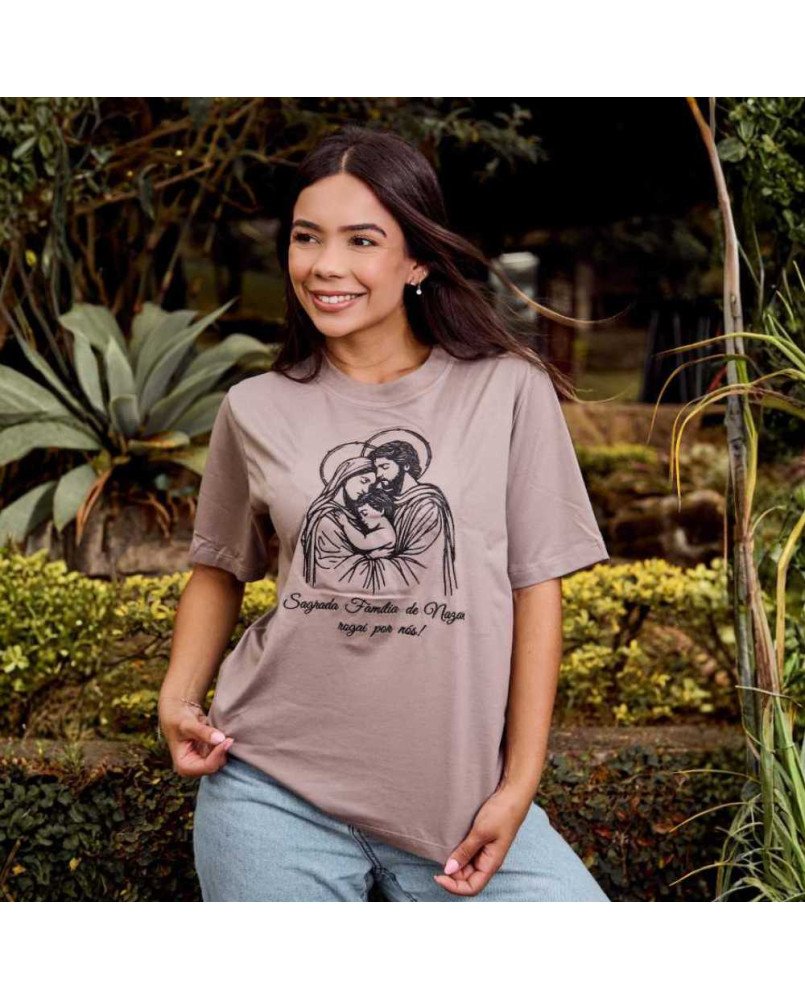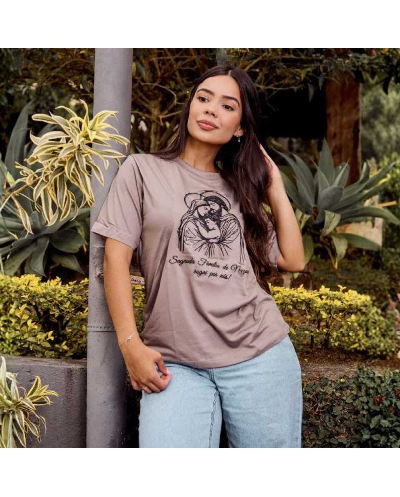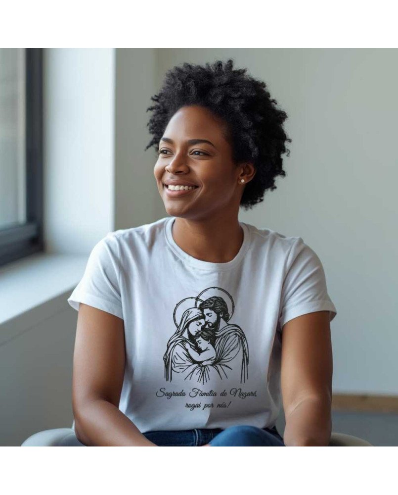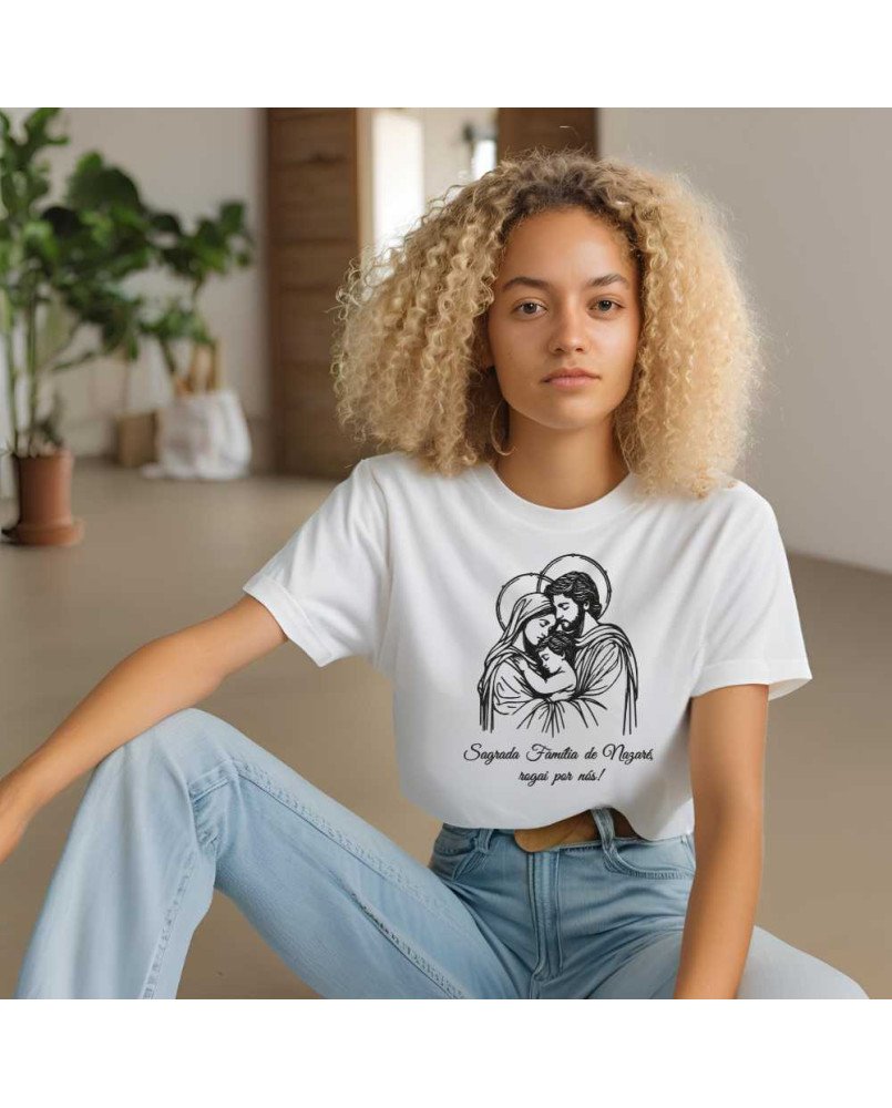 Apresentamos nossa camisa feminina católica bordada com a frase: FAMÍLIA DE NAZARÉ ROGAI POR NÓS, perfeita para demonstrar o seu carinho e amor com muita espiritualidade e estilo!