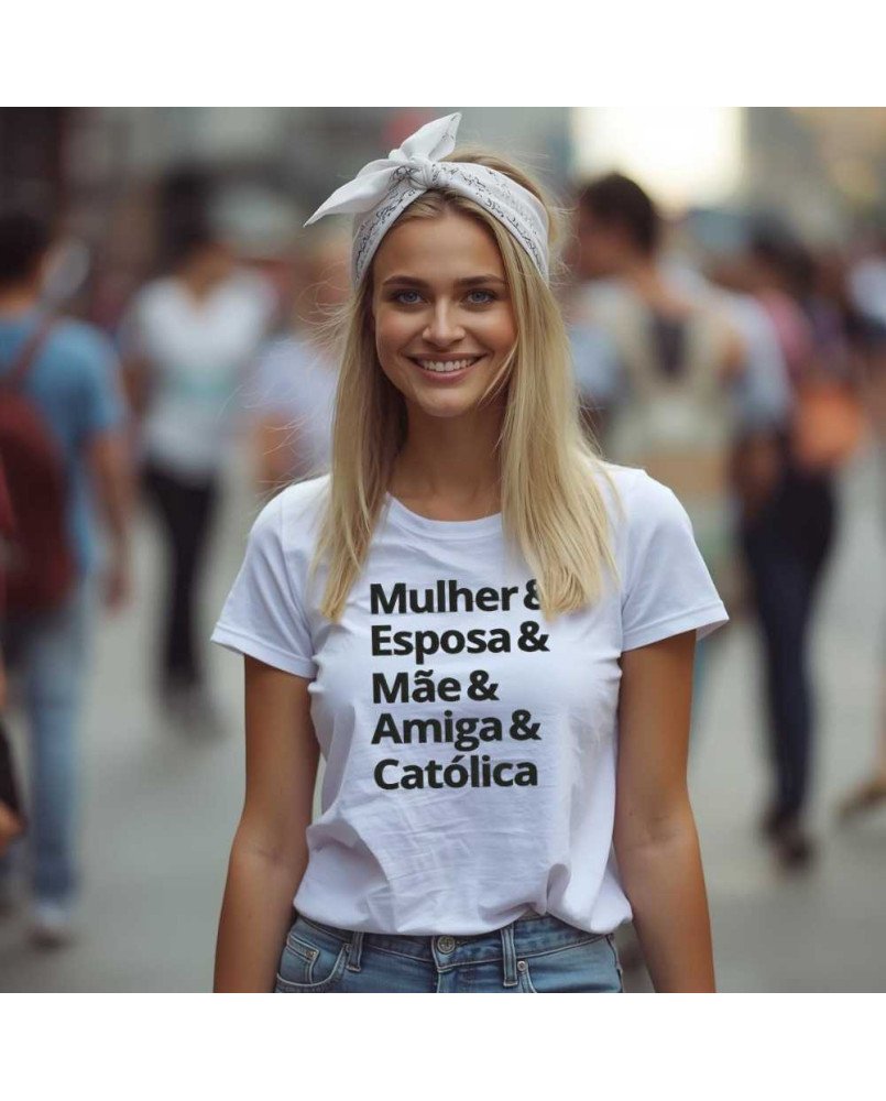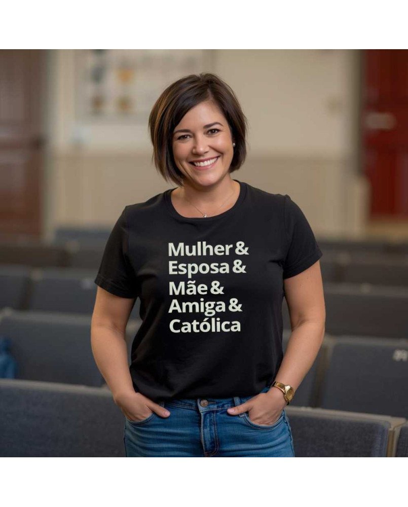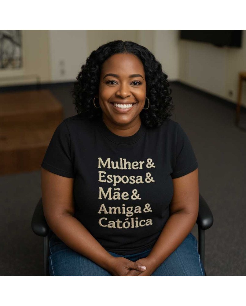 1x Camisa Feminina Católica Bordada com a frase: “MULHER & ESPOSA & MÃE & AMIGA & CATÓLICA”