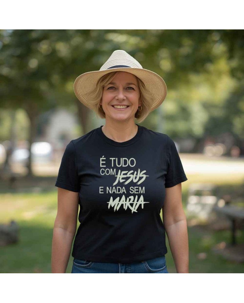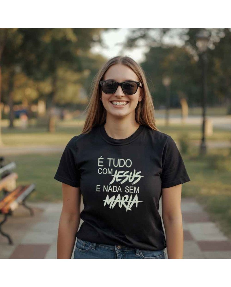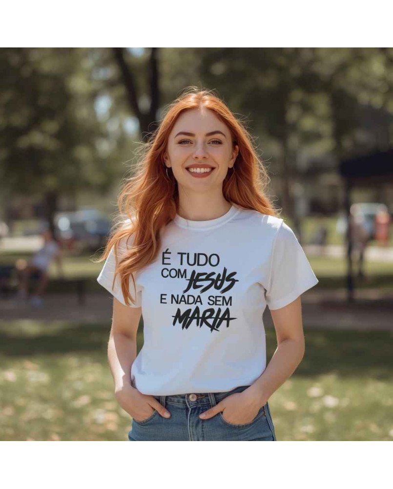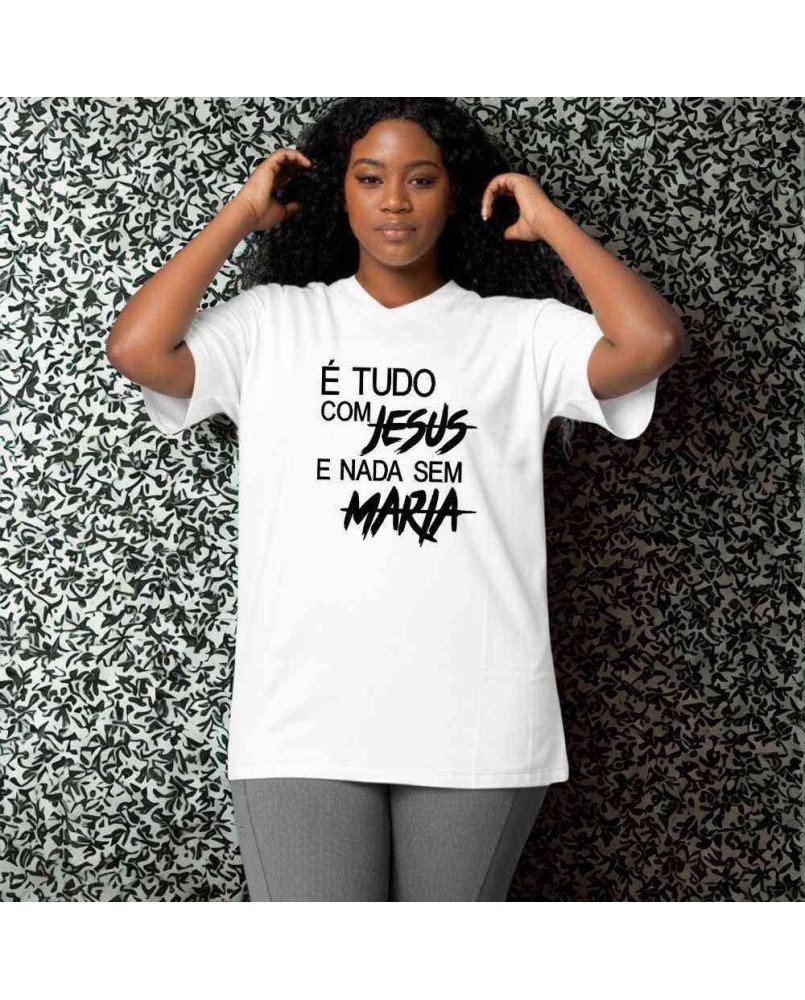 Camisa Tshirt Bordada Católica Tudo com Jesus Nada Sem Maria