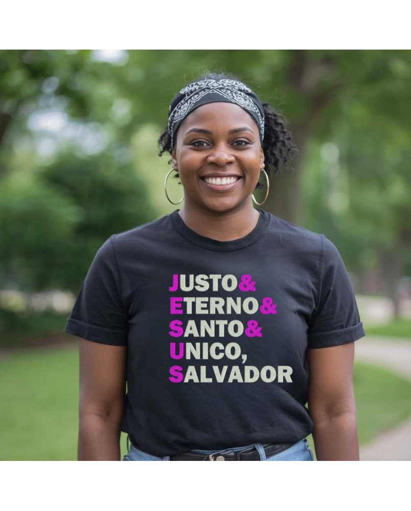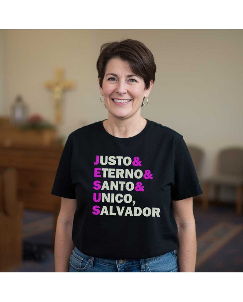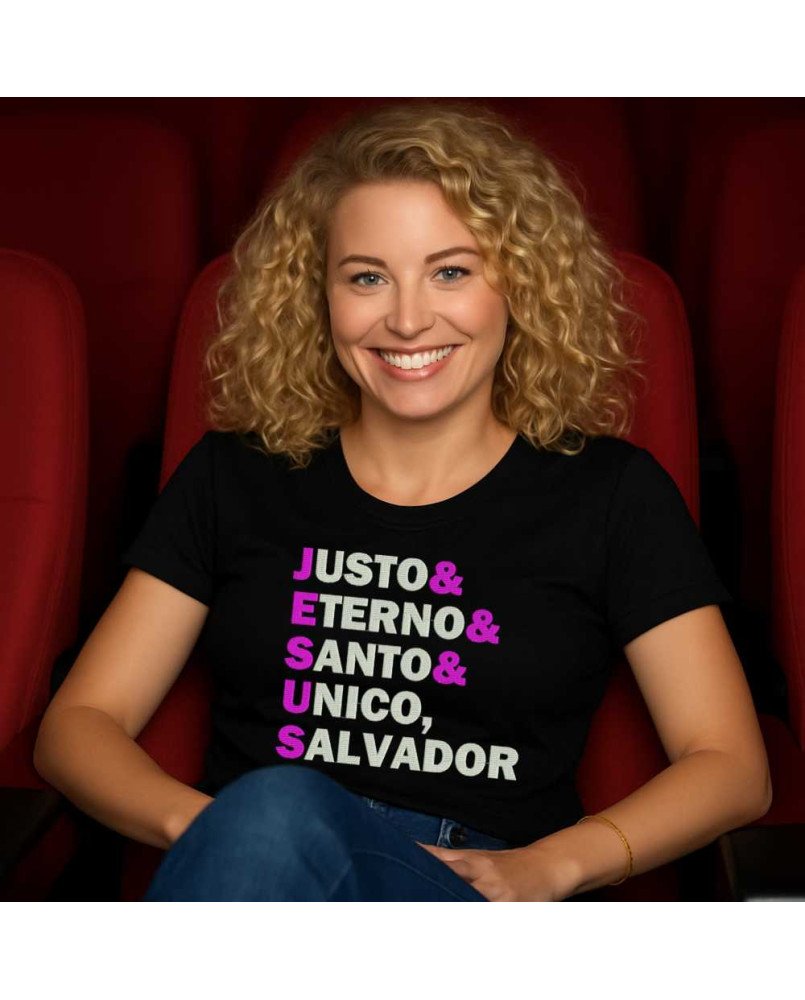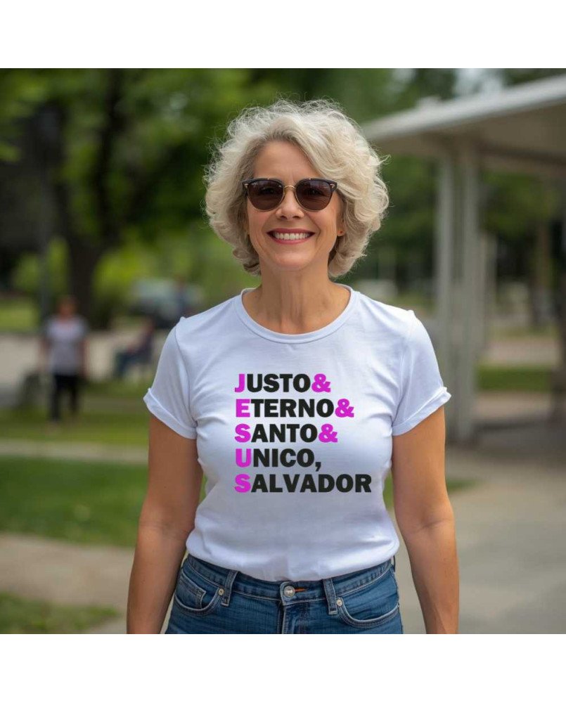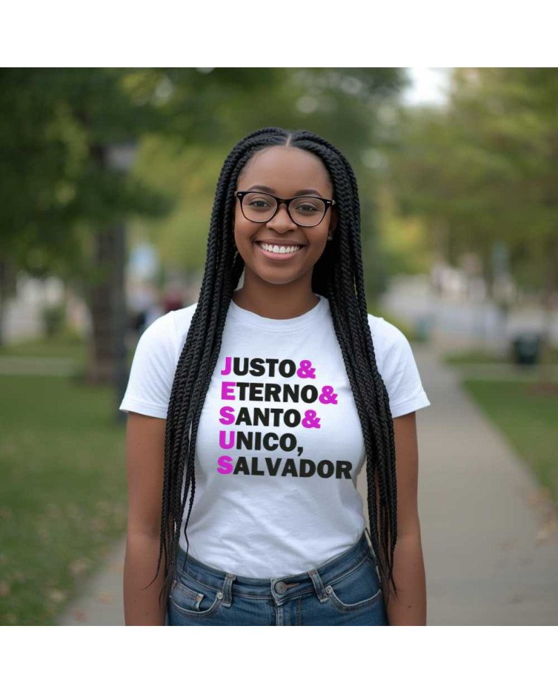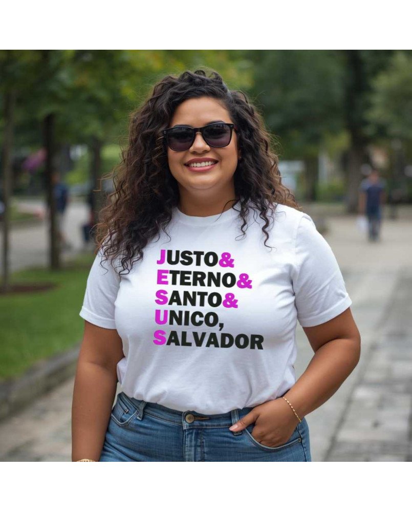 Apresentamos a nossa Camisa Feminina de Malha Lisa Bordada com a frase “Jesus: Justo Eterno Santo, Único Salvador”, uma peça exclusiva para quem deseja expressar sua fé com elegância, conforto e significado no dia a dia.