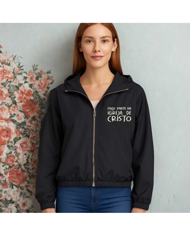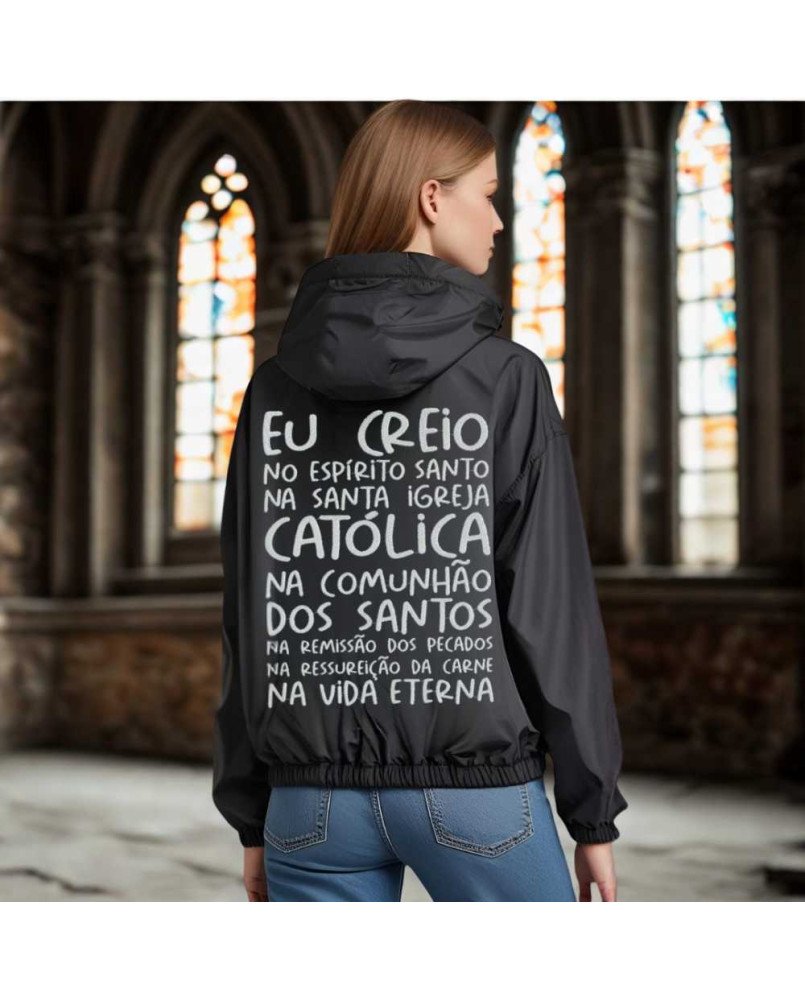 Produzido com material leve, resistente ao vento e com acabamento premium, esse casaco une proteção, conforto e devoção em uma peça só. Com um bordado exclusivo, na frente: "Faço parte da igreja de Cristo" e, nas costas: "Eu creio no Espírito Santo na Santa Igreja Católica na Comunhão dos Santos na Remissão dos Pecados na Ressureição da Carne e na Vida Eterna" de inspiração cristã que traz um toque de espiritualidade e originalidade ao seu look.
