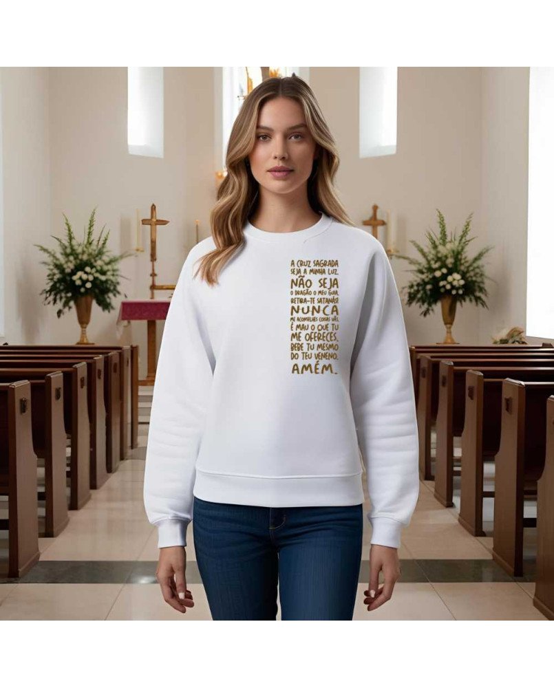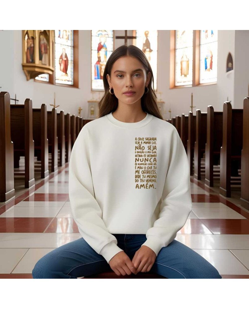 Vista sua fé e leve consigo uma mensagem de confiança em Deus e na vida. Nosso casaco de moletom bordado moda cristã católica traz o lindo escudo da medalha de São Bento juntamente com a sua oração de proteção: " A cruz sagrada seja a minha luz, Não seja o dragão o meu guia. Retira-te satanás! Nunca me aconselhes coisas vãs. É mau o que tu me ofereces. Bebe tu mesmo do teu veneno. Amém! "