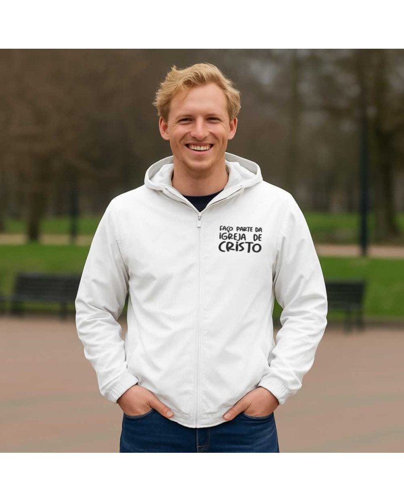 Produzido com material leve, resistente ao vento e com acabamento premium, esse casaco une proteção, conforto e devoção em uma peça só. Com um bordado exclusivo, na frente: "Faço parte da igreja de Cristo" e, nas costas: "Eu creio no Espírito Santo na Santa Igreja Católica na Comunhão dos Santos na Remissão dos Pecados na Ressureição da Carne e na Vida Eterna" de inspiração cristã que traz um toque de espiritualidade e originalidade ao seu look.
