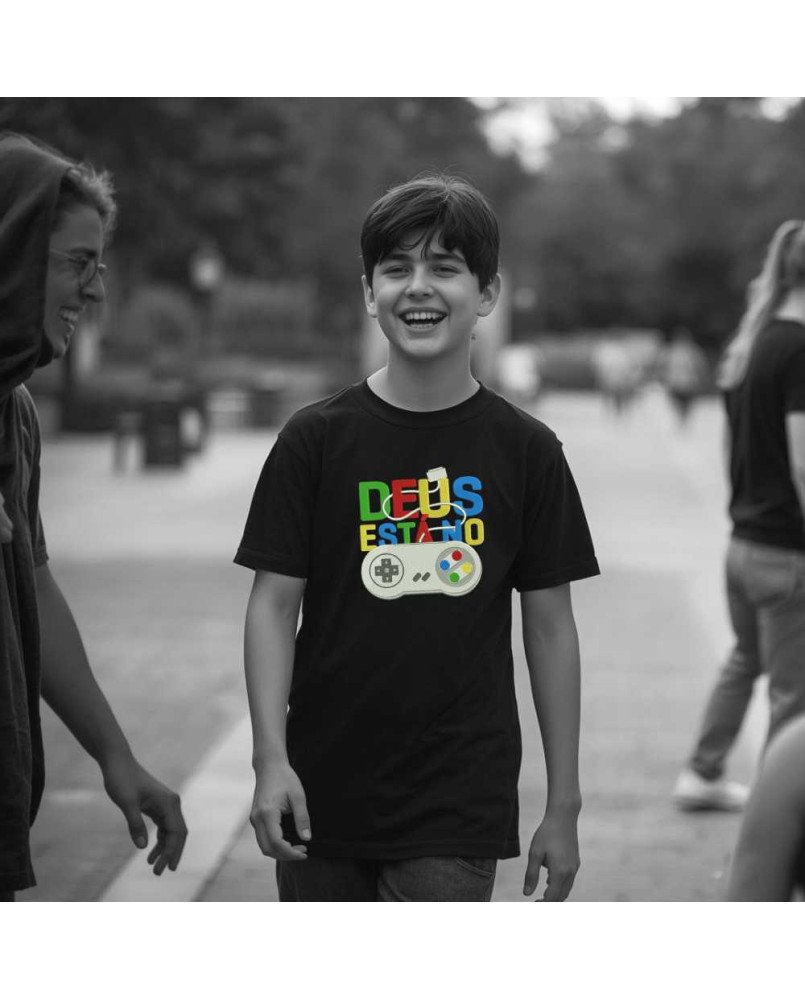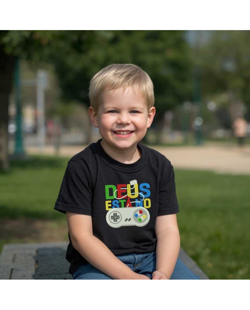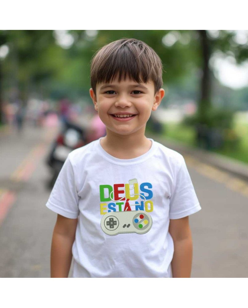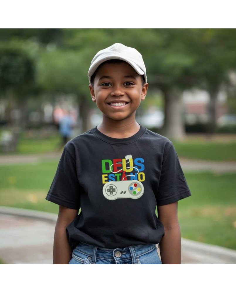 Ensine as crianças a confiarem em Deus de uma forma moderna e divertida! Nossa camisa infantil católica traz a poderosa mensagem "Deus Está no Controle", acompanhada do bordado de um controle de videogame, simbolizando que, assim como em um jogo, a vida está nas mãos d'Ele. Essa peça é perfeita para evangelizar desde cedo, transmitindo valores cristãos de maneira criativa e atual.