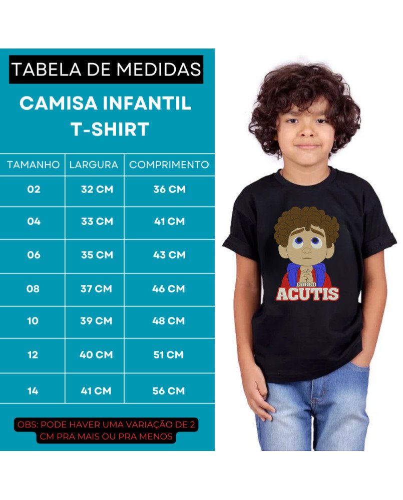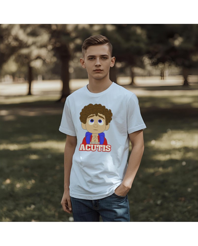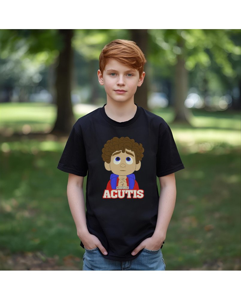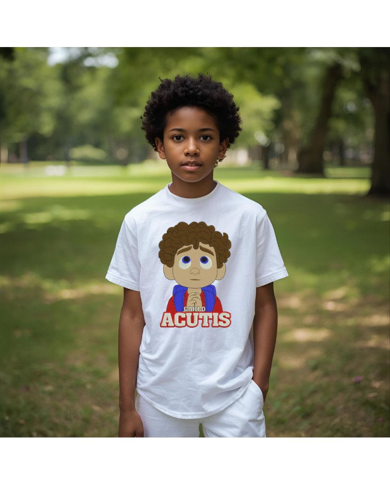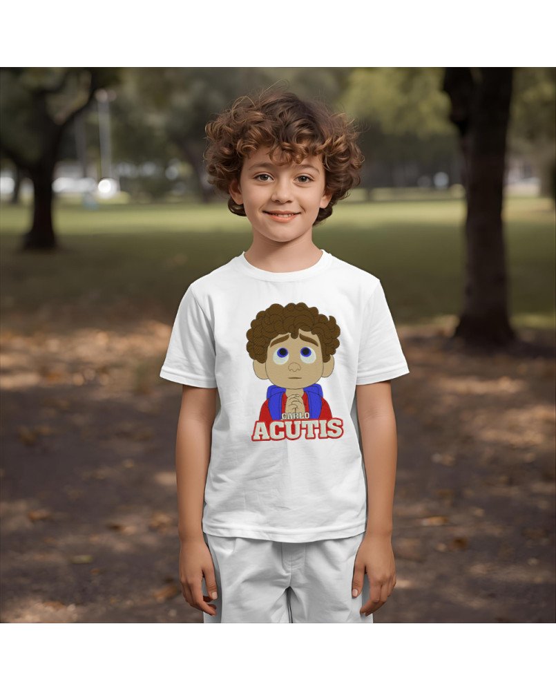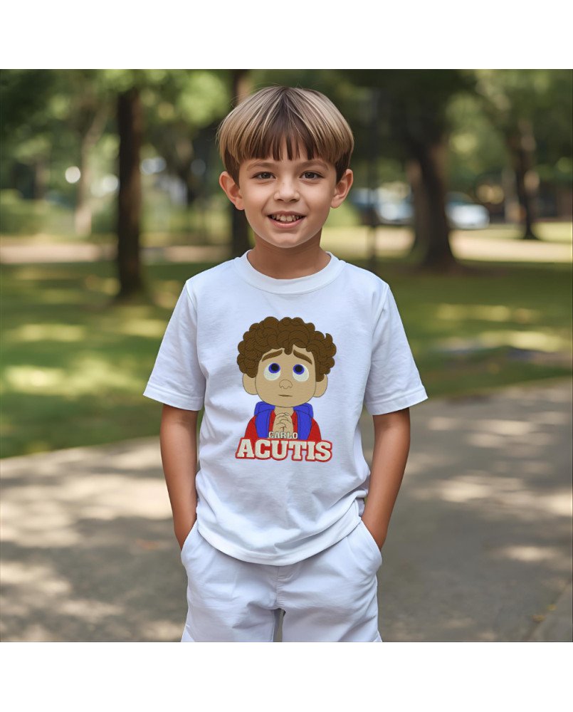 Camiseta infantil católica com bordado exclusivo de Santo Carlo Acutis