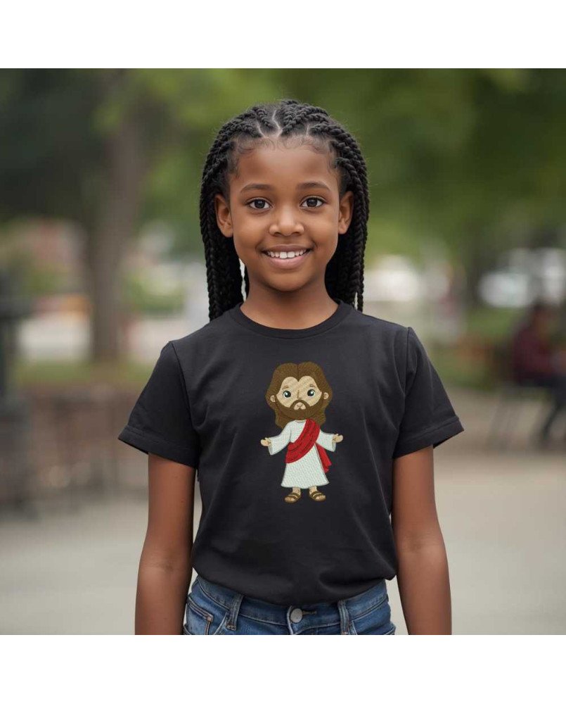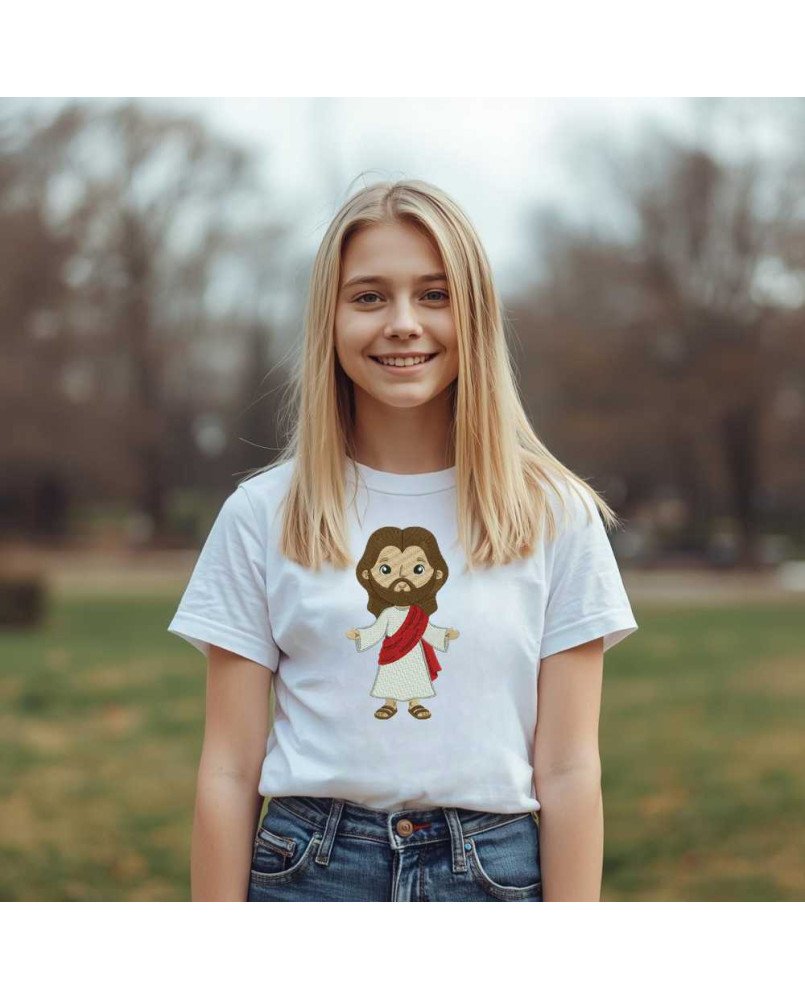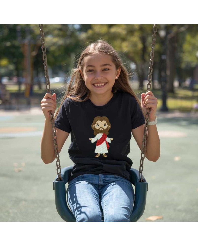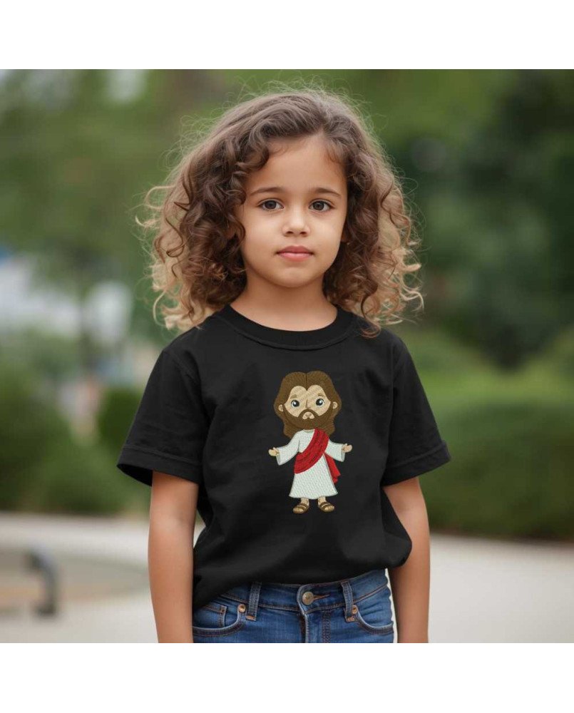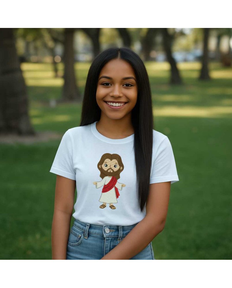 Camisa Infantil Cristã Bordada Menina Jesus em Desenho