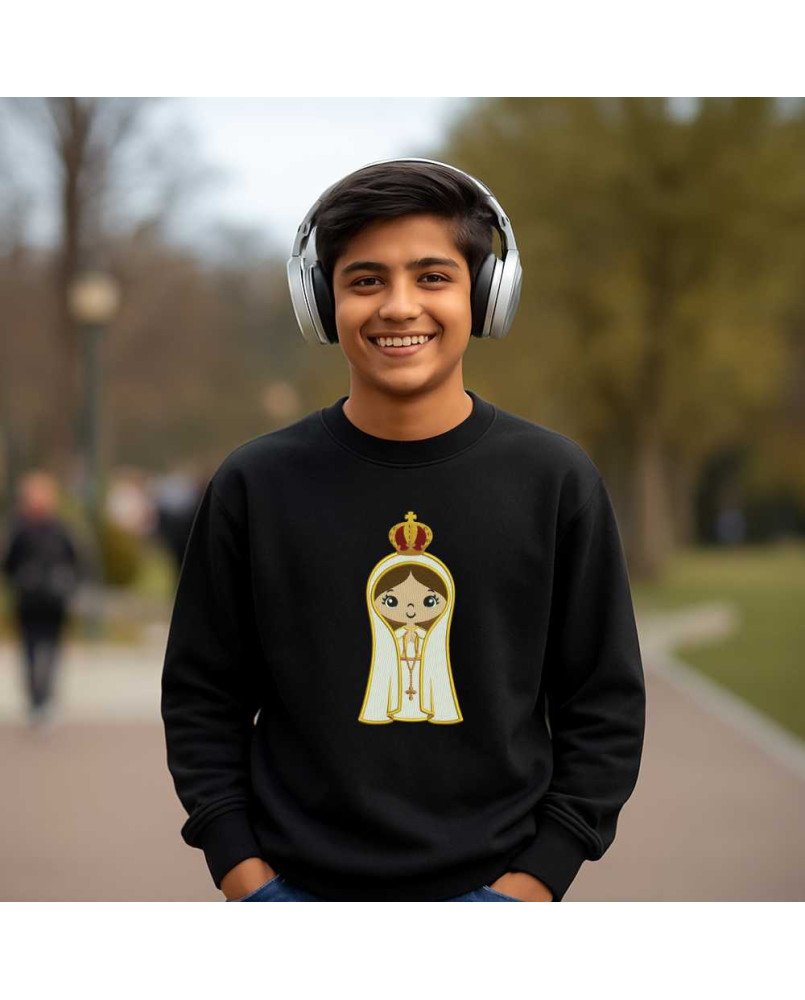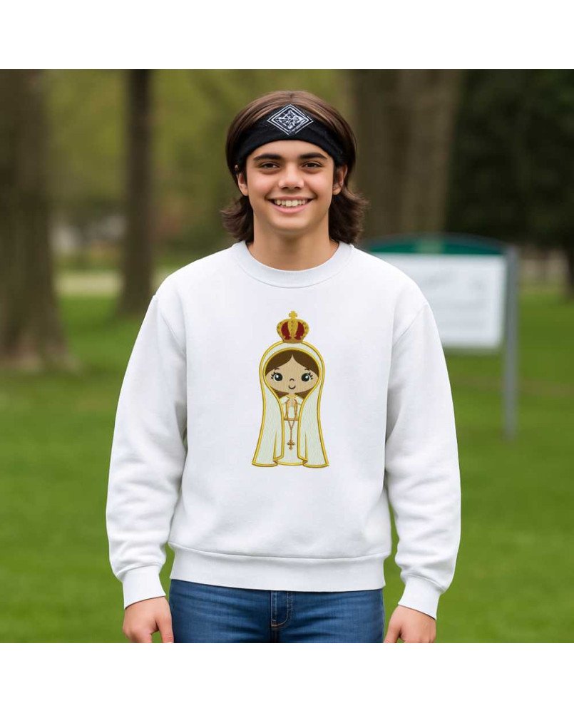 Apresentamos nosso moletom infantil bordado de Nossa Senhora de Fátima em Desenho, uma peça exclusiva da Boutique do Bordado Cristã. Confeccionada em malha premium, essa blusa de frio traz um bordado detalhado em desenho, para vestir sua criança com fé, devoção e evangelização no dia a dia.
