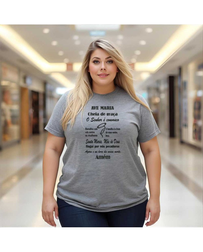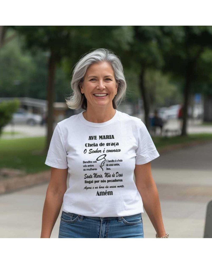 Camisa de Malha Cristã Feminina Bordada “Oração Ave Maria”