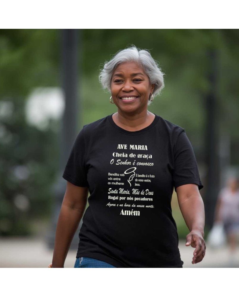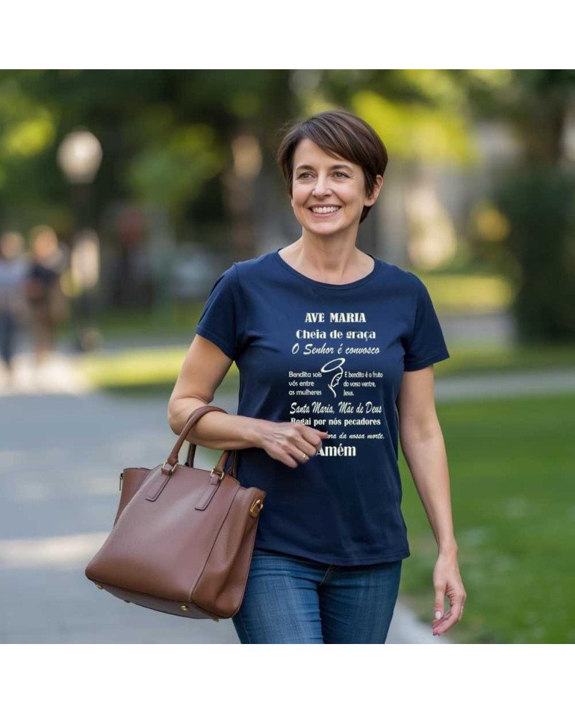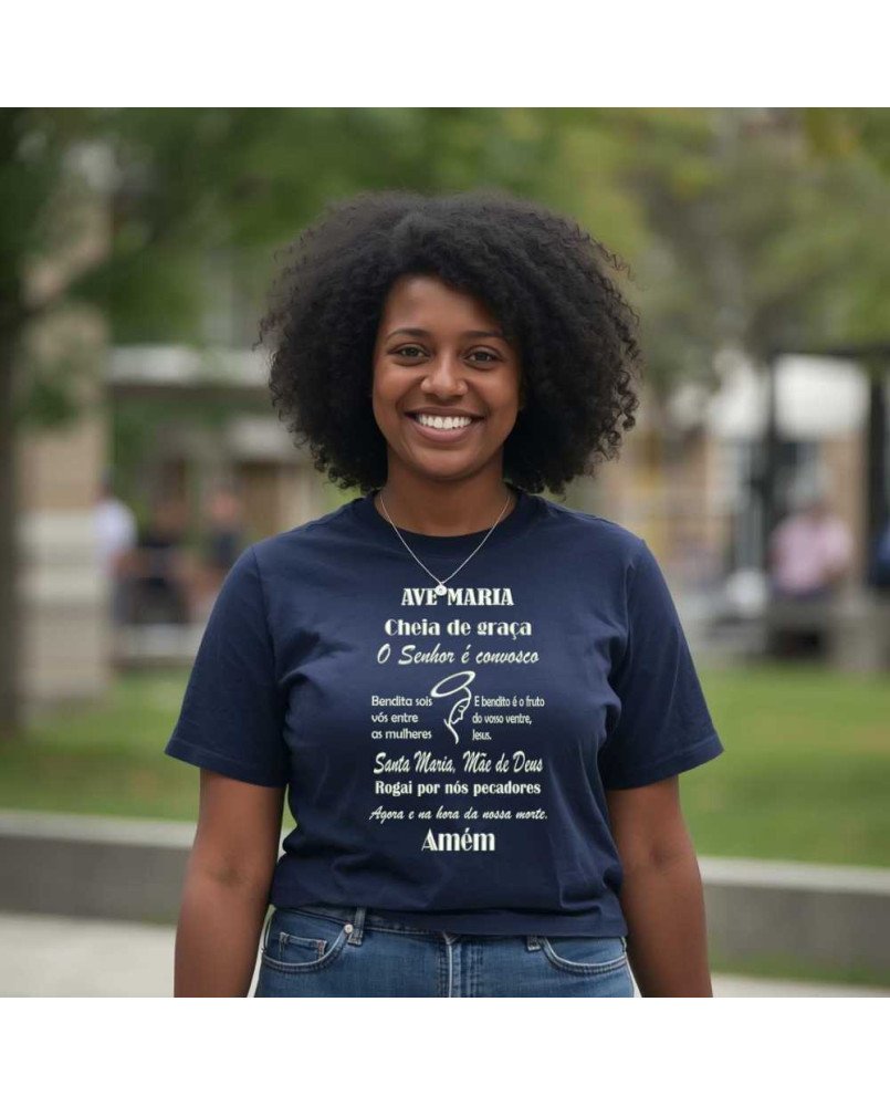 A Camiseta Cristã Feminina “Ave Maria” traz a oração completa cuidadosamente bordada, transformando uma peça básica em um testemunho público de fé e amor à Mãe de Deus.
