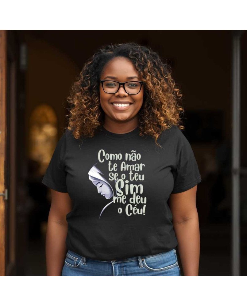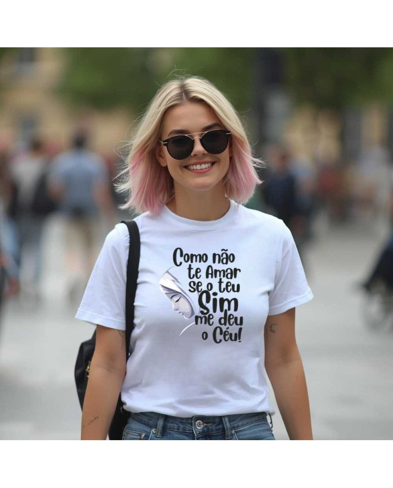 Garanta agora a Camiseta Feminina Bordada "Como não te amar se o teu sim me deu o céu!" e vista-se com fé e propósito!